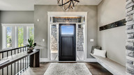 Custom built to embrace the surrounding wooded setting, this intriguing home is a rustic, modern retreat that didn't miss a design detail. With a seamless rustic and contemporary aesthetics blend, this rambler combines reclaimed beams, wide-plank white oak floors, and rich stained knotty alder that flows with the custom enameled woodwork and beautiful quartz countertops. The neutral stone fireplace, supporting stone columns, and front entry stone column are eye-catching. The custom concrete bench accents the neutral stone as an impeccable design detail from the moment you walk through the door. The kitchen, dining, and living areas all have beautiful views out the back of the home, taking in the wooded setting and water with floor-to-ceiling windows. The beautiful kitchen with stainless steel appliances and walk-in butler's pantry is an at-home chef's dream. The layers of texture throughout the home create a warm and relaxed feeling as you walk from room to room.
